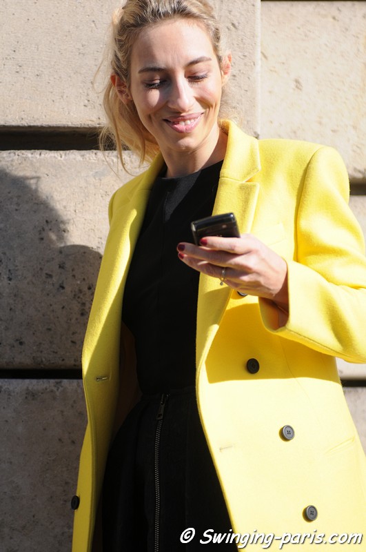 En bonne chroniqueuse Mode la très fashion Alexandra choisit un manteau cintré jaune vif.(et oui pas une doudoune) Ce choix audacieux devrait nous inspirer. Si nous osons le manteau flashy, on l’associe à du noir et comme Alexandra on reste sobre niveau coiffure et make up. On évite absolument de superposer les couleurs et le maquillage criard. Dans le même esprit on ne portera pas non plus de bijoux. L’avantage de ce type de manteau : effet bonne mine assuré !